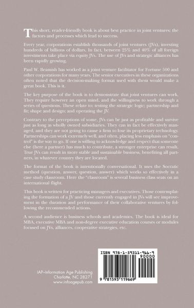 This short, reader-friendly book is about best practice in joint ventures: the factors and processes which lead to success. Every year, corporations establish thousands of joint ventures (JVs), investing hundreds of billions of dollars. In fact, between 25% and 40% of all foreign investments take place via equity JVs. The use of JVs and strategic alliances has been rapidly growing. I've worked as a joint venture facilitator for Fortune 500 and other corporations for many years. The senior executives in these organizations often noted that the decision-making format I used with them would make a great book. This is it. The key purpose of the book is to demonstrate that joint ventures can work. They require however an open mind, and the willingness to work through a series of questions I provide. These relate to: testing the strategic logic; partnership and fit; shape and design; and operating the JV. Contrary to the perceptions of some, JVs can be just as profitable and survive just as long as wholly owned subsidiaries. They can in fact be effectively managed, and they are not going to cause a firm to lose its proprietary technology. Partnerships can work extremely well, and often, placing less emphasis on "control" is the way to go. If one is willing to acknowledge and respect that someone else (here a partner) has much to contribute, a stronger enterprise can result. True JVs can result in more stable and sustainable business, benefiting all partners, in whatever country they are located. The format of the book is intentionally conversational. It uses the Socratic method (question, answer, question, answer) which works so effectively in a case study classroom. Here the "classroom" is several business class seats on an international flight. This book is written for practicing managers and executives. Those contemplating the formation of a JV and those currently engaged in JVs will see improvement in the duration and performance of their collaborative ventures by following the recommended actions. A second audience is business schools and academics. The book is ideal for MBA, executive MBA and non-degree executive education courses or modules focused on JVs, alliances, cooperative strategies, etc.