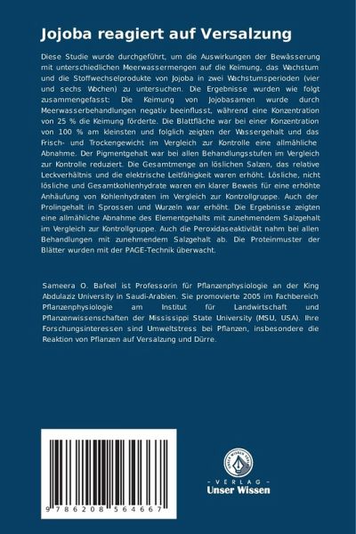 Diese Studie wurde durchgeführt, um die Auswirkungen der Bewässerung mit unterschiedlichen Meerwassermengen auf die Keimung, das Wachstum und die Stoffwechselprodukte von Jojoba in zwei Wachstumsperioden (vier und sechs Wochen) zu untersuchen. Die Ergebnisse wurden wie folgt zusammengefasst: Die Keimung von Jojobasamen wurde durch Meerwasserbehandlungen negativ beeinflusst, während eine Konzentration von 25 % die Keimung förderte. Die Blattfläche war bei einer Konzentration von 100 % am kleinsten und folglich zeigten der Wassergehalt und das Frisch- und Trockengewicht im Vergleich zur Kontrolle eine allmähliche Abnahme. Der Pigmentgehalt war bei allen Behandlungsstufen im Vergleich zur Kontrolle reduziert. Die Gesamtmenge an löslichen Salzen, das relative Leckverhältnis und die elektrische Leitfähigkeit waren erhöht. Lösliche, nicht lösliche und Gesamtkohlenhydrate waren ein klarer Beweis für eine erhöhte Anhäufung von Kohlenhydraten im Vergleich zur Kontrollgruppe. Auch der Prolingehalt in Sprossen und Wurzeln war erhöht. Die Ergebnisse zeigten eine allmähliche Abnahme des Elementgehalts mit zunehmendem Salzgehalt im Vergleich zur Kontrollgruppe. Auch die Peroxidaseaktivität nahm bei allen Behandlungen mit zunehmendem Salzgehalt ab. Die Proteinmuster der Blätter wurden mit der PAGE-Technik überwacht.