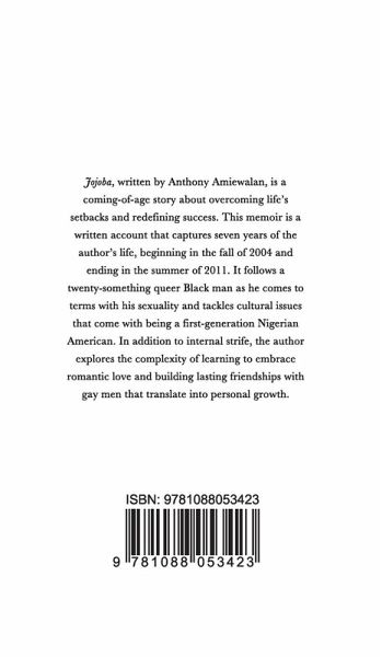 Jojoba, written by Anthony Amiewalan, is a coming-of-age story about overcoming life's setbacks and redefining success. This memoir is a written account that captures seven years of the author's life, beginning in the fall of 2004 and ending in the summer of 2011. It follows a twenty-something queer Black man as he comes to terms with his sexuality and tackles cultural issues that come with being a first-generation Nigerian American. In addition to internal strife, the author explores the complexity of learning to embrace romantic love and building lasting friendships with gay men that translate into personal growth.