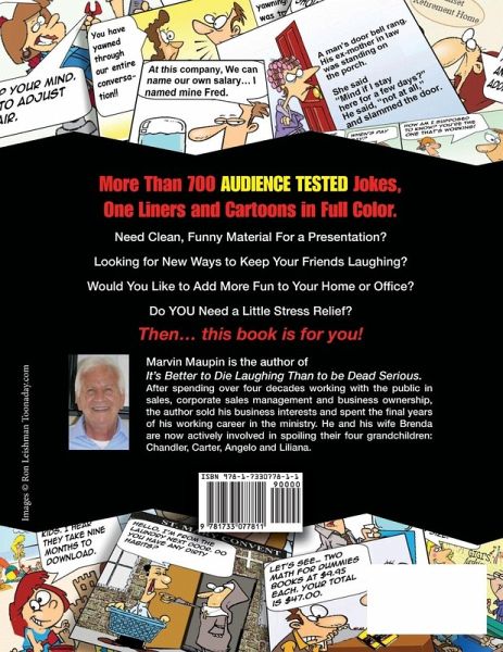 Need Clean, Funny Material For a Presentation? Looking for New Ways to Keep Your Friends Laughing? Would You Like to Add More Fun to Your Home or Office? Do YOU Need a Little Stress Relief? Then… this book is for you! More than 700 audience tested jokes, one liners and cartoons in full color