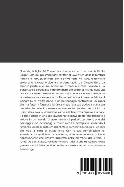 Jolanda, la figlia del Corsaro Nero è un romanzo scritto da Emilio Salgari, uno dei più importanti scrittori di avventure della letteratura italiana. Il libro, pubblicato per la prima volta nel 1905, racconta la storia di una giovane donna che viene rapita dal Corsaro Nero, un famoso pirata, e le sue avventure in mare e a terra. Jolanda è un personaggio coraggioso e determinato, che affronta le sfide della vita con forza e determinazione. La sua forza interiore e la sua intelligenza la aiutano a sopravvivere a molte peripezie e a trovare la felicità. Il Corsaro Nero, d'altra parte, è un personaggio controverso, un pirata che ha fatto la fortuna e la fama grazie alla sua audacia e alla sua crudeltà. Tuttavia, il romanzo mostra anche un altro lato di lui, un uomo che cerca la redenzione e che, alla fine, trova l'amore e la pace. Il libro è scritto in uno stile avvincente e coinvolgente, che trasporta il lettore in un mondo di avventure e di pericoli. La descrizione dei paesaggi e dei personaggi è molto vivida e dettagliata, rendendo il romanzo un'esperienza emozionante e immersiva. Si tratta di un libro che vale la pena di essere letto. Con la sua combinazione di avventura, romanticismo e suspense, offre un'esperienza unica e appassionante che rimarrà impressa nella memoria del lettore. Il romanzo è un classico della letteratura italiana che ha ispirato molte generazioni di lettori e che continua a essere amato e apprezzato ancora oggi (Aonia edizioni).