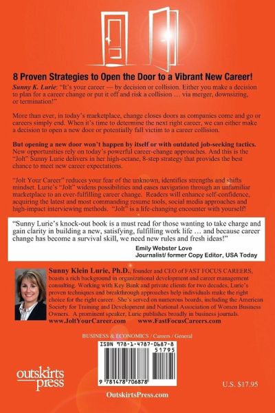 8 Proven Strategies to Open the Door to a Vibrant New Career! Sunny K. Lurie: "It's your career - by decision or collision. Either you make a decision to plan for a career change or put it off and risk a collision ... via merger, downsizing, or termination!" More than ever, in today's marketplace, change closes doors as companies come and go or careers simply end. When it's time to determine the next right career, we can either make a decision to open a new door or potentially fall victim to a career collision. But opening a new door won't happen by itself or with outdated job-seeking tactics. New opportunities rely on today's powerful career-change approaches. And this is the "Jolt" Sunny Lurie delivers in her high-octane, 8-step strategy that provides the best chance to meet new career expectations. "Jolt Your Career" reduces your fear of the unknown, identifies strengths and shifts mindset. Lurie's "Jolt" widens possibilities and eases navigation through an unfamiliar marketplace to an ever-fulfilling career change. Readers will enhance self-confidence, acquiring the latest and most commanding resume tools, social media approaches and high-impact interviewing methods. "Jolt" is a life-changing encounter with yourself! "Sunny Lurie's knock-out book is a must read for those wanting to take charge and gain clarity in building a new, satisfying, fulfilling work life ... and because career change has become a survival skill, we need new rules and fresh ideas!" Emily Webster Love, Journalist/ former Copy Editor, USA Today