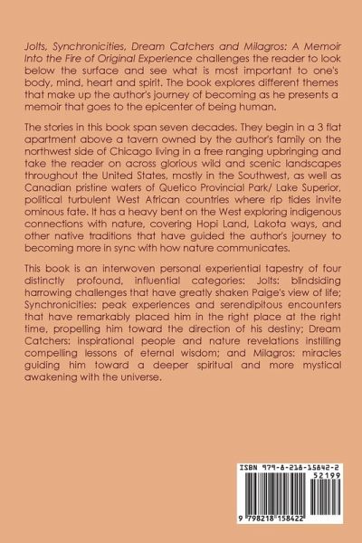 Jolts, Synchronicities, Dream Catchers and Milagros: A Memoir Into the Fire of Original Experience challenges the reader to look below the surface and see what is most important to one's body, mind, heart and spirit. The book explores different themes that make up the author's journey of becoming as he presents a memoir that goes to the epicenter of being human. The stories in this book span seven decades. They begin in a 3 flat apartment above a tavern owned by the author's family on the northwest side of Chicago living in a free ranging upbringing and take the reader on across glorious wild and scenic landscapes throughout the United States, mostly in the Southwest, as well as Canadian pristine waters of Quetico Provincial Park/ Lake Superior, political turbulent West African countries where rip tides invite ominous fate. It has a heavy bent on the West exploring indigenous connections with nature, covering Hopi Land, Lakota ways, and other native traditions that have guided the author's journey to becoming more in sync with how nature communicates. This book is an interwoven personal experiential tapestry of four distinctly profound, influential categories: Jolts: blindsiding harrowing challenges that have greatly shaken Paige's view of life; Synchronicities: peak experiences and serendipitous encounters that have remarkably placed him in the right place at the right time, propelling him toward the direction of his destiny; Dream Catchers: inspirational people and nature revelations instilling compelling lessons of eternal wisdom; and Milagros: miracles guiding him toward a deeper spiritual and more mystical awakening with the universe.