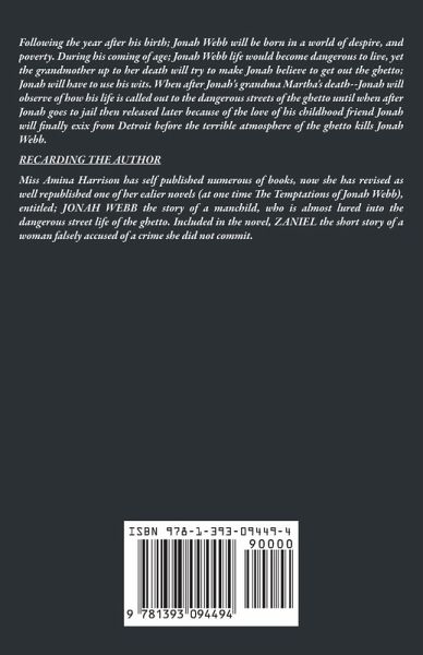 Following the year after his birth; Jonah Webb will be born in a world of despire, and poverty. During his coming of age; Jonah Webb life would become dangerous to live, yet the grandmother up to her death will try to make Jonah believe to get out the ghetto; Jonah will have to use his wits. When after Jonah's grandma Martha's death--Jonah will observe of how his life is called out to the dangerous streets of the ghetto until when after Jonah goes to jail then released later because of the love of his childhood friend Jonah will finally exix from Detroit before the terrible atmosphere of the ghetto kills Jonah Webb. RECARDING THE AUTHOR Miss Amina Harrison has self published numerous of books, now she has revised as well republished one of her ealier novels (at one time The Temptations of Jonah Webb), entitled; JONAH WEBB the story of a manchild, who is almost lured into the dangerous street life of the ghetto. Included in the novel, ZANIEL the short story of a woman falsely accused of a crime she did not commit.