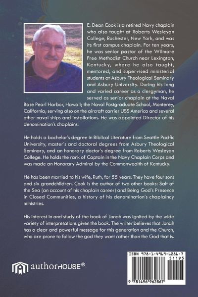 E. Dean Cook is a retired Navy chaplain who also taught at Roberts Wesleyan College, Rochester, New York, and was its first campus chaplain. For ten years, he was senior pastor of the Wilmore Free Methodist Church near Lexington, Kentucky, where he also taught, mentored, and supervised ministerial students at Asbury Theological Seminary and Asbury University. During his long and varied career as a clergyman, he served as senior chaplain at the Naval Base Pearl Harbor, Hawaii; the Naval Postgraduate School, Monterey, California; serving also on the aircraft carrier USS America and several other naval ships and installations. He was appointed Director of his denomination's chaplains. He holds a bachelor's degree in Biblical Literature from Seattle Pacific University, master's and doctoral degrees from Asbury Theological Seminary, and an honorary doctor's degree from Roberts Wesleyan College. He holds the rank of Captain in the Navy Chaplain Corps and was made an Honorary Admiral by the Commonwealth of Kentucky. He has been married to his wife, Ruth, for 55 years. They have four sons and six grandchildren. Cook is the author of two other books: Salt of the Sea (an account of his chaplain career) and Being God's Presence in Closed Communities, a history of his denomination's chaplaincy ministries. His interest in and study of the book of Jonah was ignited by the wide variety of interpretations given the book. The writer believes that Jonah has a clear and powerful message for this generation and the Church, who are prone to follow the god they want rather than the God that is.