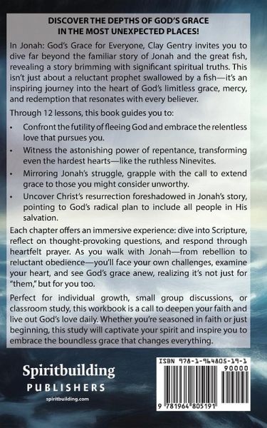DISCOVER THE DEPTHS OF GOD'S GRACE IN THE MOST UNEXPECTED PLACES! In Jonah: God's Grace for Everyone, Clay Gentry invites you to dive far beyond the familiar story of Jonah and the great fish, revealing a story brimming with significant spiritual truths. This isn't just about a reluctant prophet swallowed by a fish-it's an inspiring journey into the heart of God's limitless grace, mercy, and redemption that resonates with every believer. Through 12 lessons, this book guides you to: * Confront the futility of fleeing God and embrace the relentless love that pursues you. * Witness the astonishing power of repentance, transforming even the hardest hearts-like the ruthless Ninevites. * Mirroring Jonah's struggle, grapple with the call to extend grace to those you might consider unworthy. * Uncover Christ's resurrection foreshadowed in Jonah's story, pointing to God's radical plan to include all people in His salvation. Each chapter offers an immersive experience: dive into Scripture, reflect on thought-provoking questions, and respond through heartfelt prayer. As you walk with Jonah-from rebellion to reluctant obedience-you'll face your own challenges, examine your heart, and see God's grace anew, realizing it's not just for "them," but for you too. Perfect for individual growth, small group discussions, or classroom study, this workbook is a call to deepen your faith and live out God's love daily. Whether you're seasoned in faith or just beginning, this study will captivate your spirit and inspire you to embrace the boundless grace that changes everything.