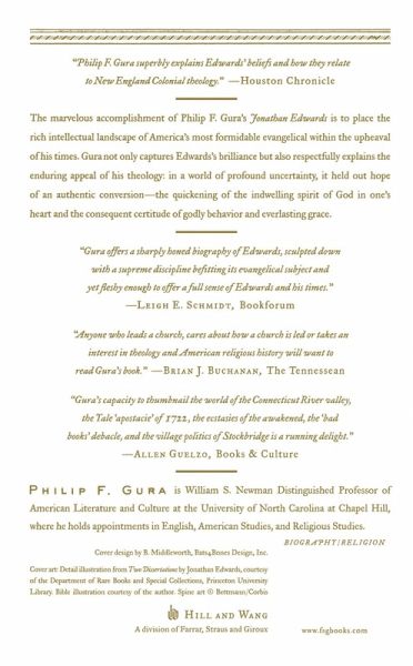 An important new biography of America's founding religious father. Jonathan Edwards was America's most influential evangelical, whose revivals of the 1730s became those against which all subsequent ones have been judged. The marvelous accomplishment of Philip Gura's Jonathan Edwards is to place the rich intellectual landscape of America's most formidable evangelical within the upheaval of his times. Gura not only captures Edwards' brilliance but respectfully explains the enduring appeal of his theology: in a world of profound uncertainty, it held out hope of an authentic conversion---the quickening of the indwelling spirit of God in one's heart and the consequent certitude of Godly behavior and everlasting grace. Tracing Jonathan Edwards' life from his birth in 1703 to his untimely death in 1758, Gura magnificently reasserts Edwards rightful claim as the father of America's evangelical tradition.