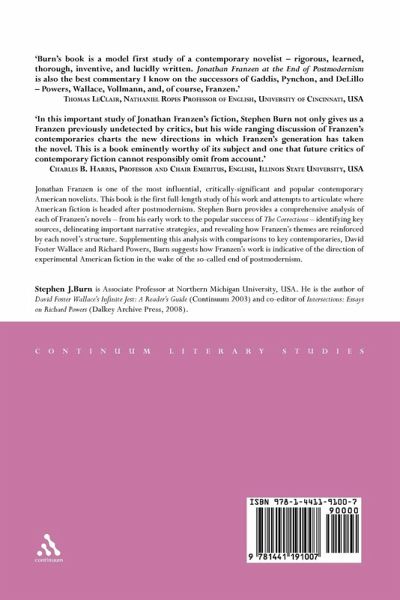 Jonathan Franzen is one of the most influential, critically-significant and popular contemporary American novelists.  This book is the first full-length study of his work and attempts to articulate where American fiction is headed after postmodernism.  Stephen Burn provides a comprehensive analysis of each of Franzen's novels - from his early work to the major success of The Corrections - identifying key sources, delineating important narrative strategies, and revealing how Franzen's themes are reinforced by each novel's structure. Supplementing this analysis with comparisons to key contemporaries, David Foster Wallace and Richard Powers, Burn suggests how Franzen's work is indicative of the direction of experimental American fiction in the wake of the so-called end of postmodernism.