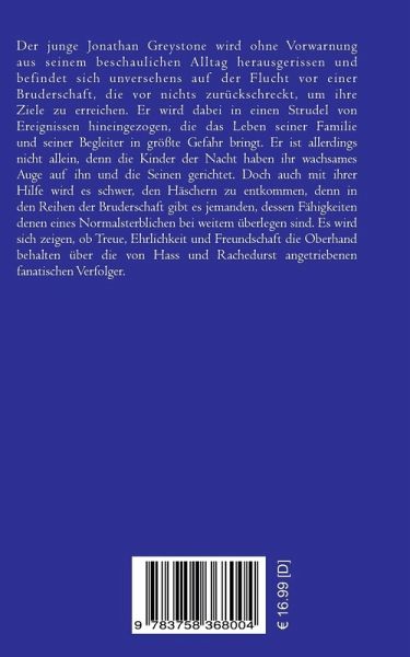 Der junge Jonathan Greystone wird ohne Vorwarnung aus seinem beschaulichen Alltag herausgerissen und befindet sich unversehens auf der Flucht vor einer Bruderschaft, die vor nichts zurückschreckt um ihre Ziele zu erreichen. Er wird dabei in einen Strudel von Ereignissen hineingezogen, die das Leben seiner Familie und seiner Begleiter in größte Gefahr bringt. Er ist allerdings nicht allein, denn die Kinderder Nacht haben ihr wachsames Auge auf ihn und die Seinengerichtet. Doch auch mit ihrer Hilfe wird es schwer den Häschern zu entkommen, denn in den Reihen der Bruderschaftgibt es jemanden, dessen Fähigkeiten denen eines Normalsterblichen bei weitem überlegen sind. Es wird sich zeigen, ob Treue, Ehrlichkeit und Freundschaft die Oberhand behalten über die von Hass und Rachedurst angetriebenen fanatischen Verfolger.