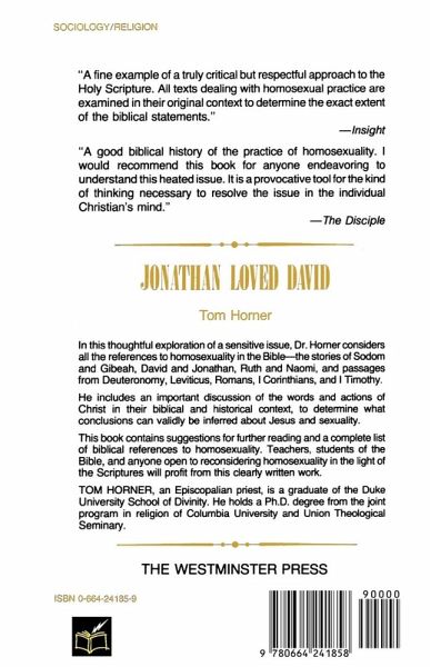 In this thoughtful exploration of a sensitive issue, Tom Horner considers all the references to homosexuality in the Bible--the stories of Sodom and Gibeah, David and Jonathan, Ruth and Naomi, and passages from Deuteronomy, Leviticus, Romans, I Corinthians, and I Timothy. He includes an important discussion of the words and actions of Christ in their biblical and historical context, to determine what conclusions can validly be inferred about Jesus and sexuality. This book contains suggestions for further reading and a complete list of biblical references to homosexuality. Teachers, students, and anyone open to reconsidering homosexuality in the light of the Scriptures will profit from this clearly written work.