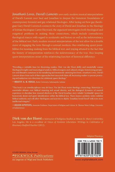 Jonathan's Loves, David's Laments uses early modern musical interpretations of David's Lament over Saul and Jonathan to deepen the historicist foundations of contemporary feminist and gay relational theologies. After laying out how gay theologian Gary David Comstock connects the story of David and Jonathan to the theology of lesbian theologian Carter Heyward, the argument interrogates both theological and exegetical problems in making those connections, which include contradictory theological stances with regard to modernity and history as well as the indeterminacy of the biblical text. Early modern musical interpretations of the text allow for a double move of engaging the texts through a sensual medium, thus reinforcing queer possibilities for meaning-making from the biblical text, and staying attuned to the fact that the history of interpretation reinforces the indeterminacy of the text, thus keeping queer interpretations aware of the relativizing function of historical difference.