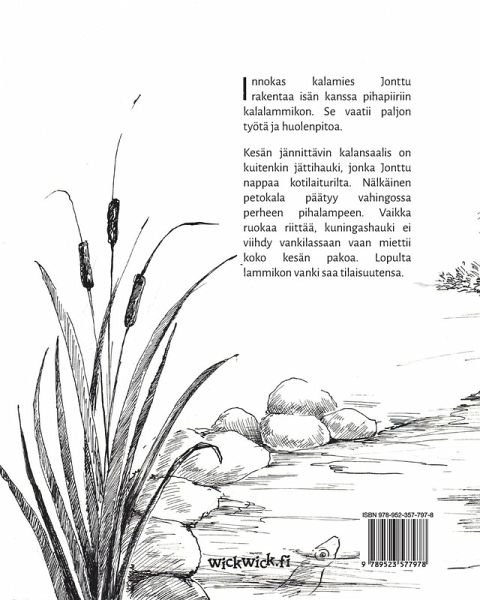 Jonty loves to fish, so he and his dad build a fishpond in their yard. The pond takes a lot of work and maintenance, but Jonty is thrilled to have the chance to fish for rainbow trout.The most exciting catch of the summer, however, is a giant pike, which Jonty catches from the dock on the lake. By accident, the hungry fish winds up in the fishpond! Even though there's plenty of food available, the pike doesn't like being imprisoned in a pond. Then one day it tries to escape! --- Innokas kalamies Jonttu rakentaa isän kanssa pihapiiriin kalalammikon. Se vaatii paljon työtä ja huolenpitoa.Kesän jännittävin kalansaalis on kuitenkin jättihauki, jonka Jonttu nappaa kotilaiturilta. Nälkäinen petokala päätyy vahingossa perheen pihalampeen. Vaikka ruokaa riittää, kuningashauki ei viihdy vankilassaan vaan miettii koko kesän pakoa. Lopulta lammikon vanki saa tilaisuutensa.