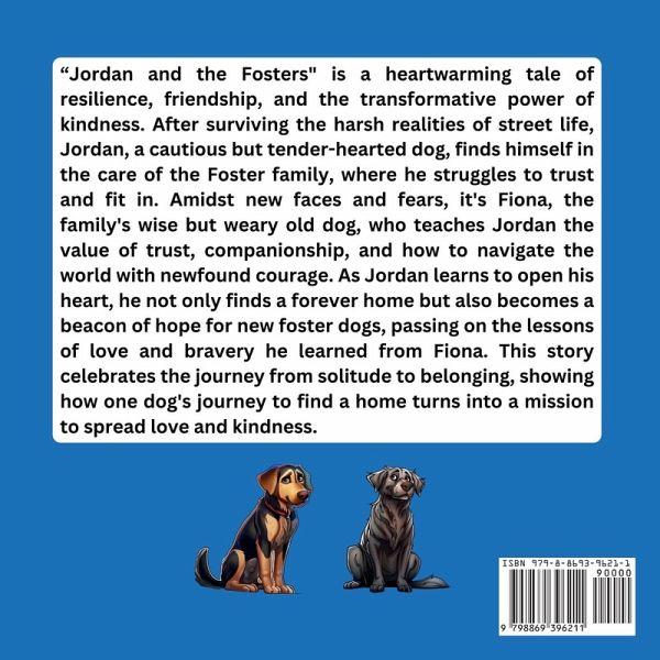 "Jordan and the Fosters" is a heartwarming tale of resilience, friendship, and the transformative power of kindness. After surviving the harsh realities of street life, Jordan, a cautious but tender-hearted dog, finds himself in the care of the Foster family, where he struggles to trust and fit in. Amidst new faces and fears, it's Fiona, the family's wise but weary old dog, who teaches Jordan the value of trust, companionship, and how to navigate the world with newfound courage. As Jordan learns to open his heart, he not only finds a forever home but also becomes a beacon of hope for new foster dogs, passing on the lessons of love and bravery he learned from Fiona. This story celebrates the journey from solitude to belonging, showing how one dog's journey to find a home turns into a mission to spread love and kindness.