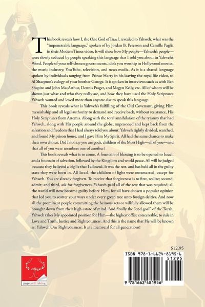 This book reveals how I, the One God of Israel, revealed to Yahweh, what was the "impenetrable language," spoken of by Jordan B. Peterson and Camille Paglia in their Modern Times video. It will show how My people--Yahweh's people--were slowly seduced by people speaking this language that I told you about in Yahweh's Word. People of your self-chosen governments, idols you worship in Hollywood movies, the music industry, YouTube, television, and news media. As it is a shared language spoken by individuals ranging from Prince Harry in his leaving the royal life video, to Al Sharpton's eulogy of your brother George. It is spoken in interviews such as with Ben Shapiro and John MacArthur, Dennis Prager, and Megyn Kelly, etc. All of whom will be shown just what and who they really are, and how they have used the Holy Scriptures Yahweh wanted and loved more than anyone else to speak this language. This book reveals what is Yahweh's fulfilling of the Old Covenant, giving Him messiahship and all legal authority to demand and receive back, without resistance, His Holy Scriptures from Artemis. Along with the total annihilation of the tyranny that had Yahweh, along with His people around the globe, imprisoned and kept back from the salvation and freedom that I had always told you about. Yahweh rightly divided, searched, and found My prison house, and I gave Him My Spirit. All had the same chance to make their own choice. Did I not say you are gods, children of the Most High--all of you--and that all of you were members one of another? This book reveals what is to come. A fountain of blessing is to be opened to Israel, and a fountain of salvation, followed by the Kingdom and world peace. All will be judged because they believed a big lie that I allowed. It was the test, and has held all in the guilty state they were born in. All Israel, the children of light were outsmarted, except for Yahweh. You are already forgiven. To receive that forgiveness is to first, realize; second, admit; and third, ask for forgiveness. Yahweh paid all of the rest that was required; all the world will now become guilty before Him, for all have chosen a popular opinion that led you to scatter your ways under every green tree unto foreign deities. And now all the prominent people committing the heinous acts or willfully allowed them will be brought down from their high estate of mind. And finally the "end goal" of the Torah, Yahweh takes My appointed position for Him--the highest office conceivable, to rule in Love and Truth, Justice and Righteousness. And this is the name that He will be known as: Yahweh Our Righteousness. It is a memorial for all generations!