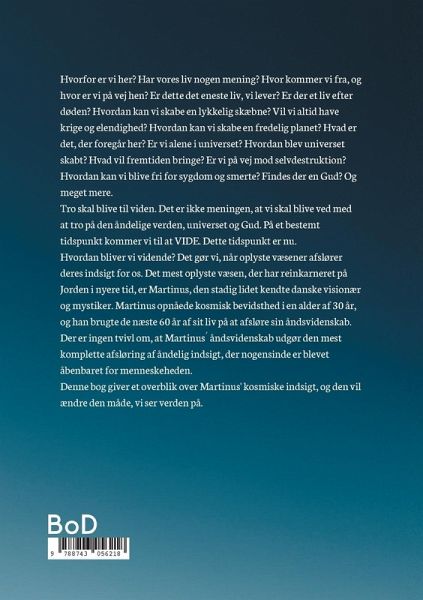 Hvorfor er vi her? Har vores liv nogen mening? Hvor kommer vi fra, og hvor er vi på vej hen? Er dette det eneste liv, vi lever? Er der et liv efter døden? Hvordan kan vi skabe en lykkelig skæbne? Vil vi altid have krige og elendighed? Hvordan kan vi skabe en fredelig planet? Hvad er det, der foregår her? Er vi alene i universet? Hvordan blev universet skabt? Hvad vil fremtiden bringe? Er vi på vej mod selvdestruktion? Hvordan kan vi blive fri for sygdom og smerte? Findes der en Gud? Og meget mere. Tro skal blive til viden. Det er ikke meningen, at vi skal blive ved med at tro på den åndelige verden, universet og Gud. På et bestemt tidspunkt kommer vi til at VIDE. Dette tidspunkt er nu. Hvordan bliver vi vidende? Det gør vi, når oplyste væsener afslører deres indsigt for os. Det mest oplyste væsen, der har reinkarneret på Jorden i nyere tid, er Martinus, den stadig lidet kendte danske visionær og mystiker. Martinus opnåede kosmisk bevidsthed i en alder af 30 år, og han brugte de næste 60 år af sit liv på at afsløre sin åndsvidenskab. Der er ingen tvivl om, at Martinus¿ åndsvidenskab udgør den mest komplette afsløring af åndelig indsigt, der nogensinde er blevet åbenbaret for menneskeheden. Denne bog giver et overblik over Martinus' kosmiske indsigt, og den vil ændre den måde, vi ser verden på.