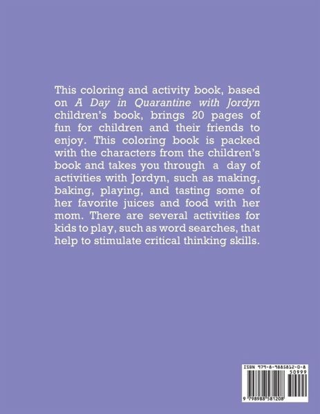 This coloring and activity book, based on A Day in Quarantine with Jordyn children's book, brings 20 pages of fun for children and their friends to enjoy. This coloring book is packed with the characters from the children's book and takes you through a day of activities with Jordyn, such as making, baking, playing, and tasting some of her favorite juices and food with her mom. There are several activities for kids to play, such as word searches, that help to stimulate critical thinking skills.