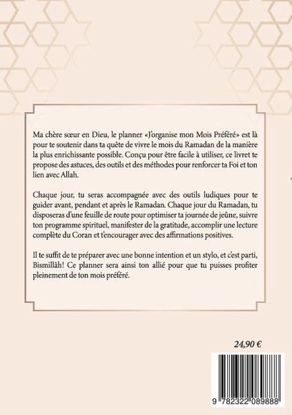 Le planner "J'organise mon mois préféré" est spécialement conçu pour vous aider à maximiser votre expérience durant le mois sacré du Ramadan. Ce livret facile à utiliser est accessible à tous et vous permettra de vivre votre vie spirituelle de manière organisée et paisible. Il comprend des astuces pour renforcer votre foi et votre connexion spirituelle.Vous serez accompagné jour par jour avec des outils ludiques pour vous orienter avant, pendant et après le Ramadan.Chaque jour, vous serez guidé par une feuille de route qui inclura une citation inspirante pour vous motiver et un aperçu de vos activités quotidiennes telles que vos prières, la lecture du Coran, l'apprentissage des noms de Dieu, l'avancement de vos objectifs spirituels, votre liste de tâches quotidiennes et vos moments de gratitude.Il vous suffit de vous préparer avec une bonne intention et un stylo. En avant !