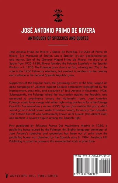 José Antonio Primo de Rivera y Sáenz de Heredia, 1st Duke of Primo de Rivera, 3rd Marquess of Estella, was a Spanish lawyer, parliamentarian, and martyr. Son of the General Miguel Primo de Rivera, the dictator of Spain from 1923-1930, Rivera founded the Falange Española - the Spanish Phalanx - in 1933. The Falange grew slowly at first, winning just .7% of the vote in the 1936 February elections, but swelled in numbers as the tyranny and violence in the Second Spanish Republic grew. Supporters of the Popular Front, the governing party at the time, waged an open campaign of violence against Spanish nationalists highlighted by the imprisonment, show-trial, and execution of José Antonio in November 1936. Subsequently, the Falange joined the insurrection against the Republic, and ascended to prominence among the Nationalist ranks. José Antonio's Falange would later merge with other right-wing parties to form the Falange Española Tradicionalista y de las JONS, Spain's pan-nationalist party which would go on to hold power, under Francisco Franco, for nearly four decades. José Antonio himself was posthumously known as El Ausente (The Absent One) and became a revered figure among the Spanish right. First published by Ediciones Prensa Del Movimiento Madrid in 1950, a publishing house owned by the Falange, this English-language anthology of José Antonio's speeches and quotations has been out of print since the publishing house was dissolved by the Spanish state in 1984. Antelope Hill Publishing is proud to preserve this monumental work in print form.