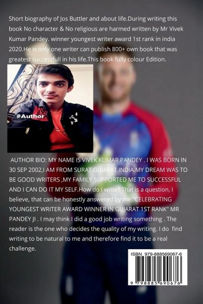 Short biography of Jos Buttler and about life.During writing this book No character & No religious are harmed written by Mr Vivek Kumar Pandey. winner youngest writer award 1st rank in india 2020.He is only one writer can publish 800+ own book that was greatest successfull in his life.This All Credit Goes To My Super Hero Daddy. This book fully colour Edition.