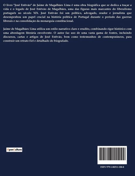 O livro "José Estêvão" de Jaime de Magalhães Lima é uma obra biográfica que se dedica a traçar a vida e o legado de José Estêvão de Magalhães, uma das figuras mais marcantes do liberalismo português no século XIX. José Estêvão foi um político, advogado, orador e jornalista que desempenhou um papel crucial na história política de Portugal durante o período das guerras liberais e na consolidação da monarquia constitucional. Jaime de Magalhães Lima utiliza um estilo narrativo claro e erudito, combinando rigor histórico com uma abordagem literária envolvente. O autor faz uso de uma vasta gama de fontes, incluindo discursos, cartas e artigos de José Estêvão, bem como testemunhos de contemporâneos, para construir um retrato fiel e detalhado do biografado.
