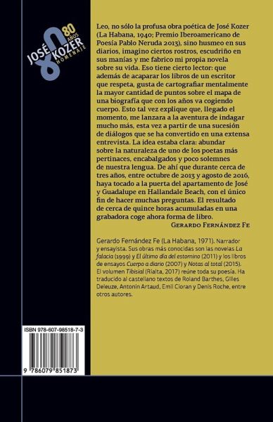 "Leo, no sólo la profusa obra poética de José Kozer (La Habana, 1940; Premio Iberoamericano de Poesía Pablo Neruda 2013), sino husmeo en sus diarios, imagino ciertos rostros, escudriño en sus manías y me fabrico mi propia novela sobre su vida. Eso tiene cierto lector: que además de acaparar los libros de un escritor que respeta, gusta de cartografiar mentalmente la mayor cantidad de puntos sobre el mapa de una biografía que con los años va cogiendo cuerpo. Esto tal vez explique que, llegado el momento, me lanzara a la aventura de indagar mucho más, esta vez a partir de una sucesión de diálogos que se ha convertido en una extensa entrevista. La idea estaba clara: abundar sobre la naturaleza de uno de los poetas más pertinaces, encabalgados y poco solemnes de nuestra lengua. De ahí que, durante cerca de tres años, entre octubre de 2013 y agosto de 2016, haya tocado a la puerta del apartamento de José y Guadalupe en Hallandale Beach, con el único fin de hacer muchas preguntas. El resultado de cerca de quince horas acumuladas en una grabadora coge ahora forma de libro." --Gerardo Fernández Fe