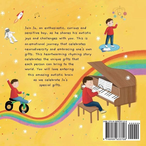 A heartwarming story celebrating the unique gifts each person brings into the world. Join Jo, a remarkable autistic boy, on a colorful adventure celebrating his love for science, music, books, spinning wonders, and his trusty green bike. In this heartwarming tale told in rhyme and brought to life with enchanting illustrations, Jo's special gifts shine, teaching kids the beauty of embracing uniqueness. Explore the world with Jo, where noise-canceling headphones and AAC devices become symbols of understanding and acceptance. A delightful journey that encourages children to celebrate their extraordinary minds! Teachers and parents will enjoy adding this book to their bookshelf: · Representation: Not only are children on the autism spectrum celebrated, but the author, illustrator, and editor of the book are all mothers to autistic children. · Sensory Accommodations: The beautifully colored illustrations highlight the use of the AAC device and noise-canceling headphones. · Inclusivity: Encourages autistic children to embrace their special gifts and their amazing, unique brains. · Parental Advice: Additional helpful tips and insight are provided by the author, who is also a family doctor.