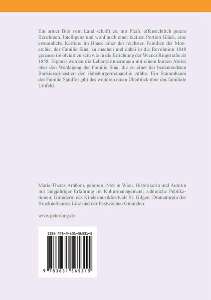 Ein armer Bub vom Land schafft es, mit Fleiß, offensichtlich gutem Benehmen, Intelligenz und wohl auch einer kleinen Portion Glück, eine erstaunliche Karriere im Hause einer der reichsten Familien der Monarchie, der Familie Sina, zu machen und dabei in die Revolution 1848 genauso involviert zu sein wie in die Errichtung der Wiener Ringstraße ab 1858. Ergänzt werden die Lebenserinnerungen mit einem kurzen Abriss über den Werdegang der Familie Sina, die zu einer der bedeutendsten Bankiersdynastien der Habsburgermonarchie zählte. Ein Stammbaum der Familie Stauffer gibt des weiteren einen Überblick über das familiale Umfeld.