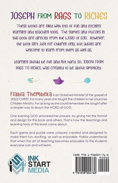 These books are filled with lots of fun and exciting learning and teaching tools. The games and puzzles in this book are directly from the WORD of GOD. However, the book isn't just for children only, but adults are welcome to learn from them as well as. Learning should be fun and not hard. So, JOSEPH FROM RAGS TO RICHES, was created to be about simplicity.
