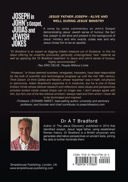 THE GOSPEL OF JOHN HAS BEEN SUBJECT TO NEARLY TWO THOUSAND YEARS OF SCRUTINY. THE PREVAILING VIEW HAS ALWAYS BEEN THAT JESUS’ LEGAL FATHER JOSEPH WAS DEAD. IN HIS EXTRAORDINARY NEW BOOK, DR BRADFORD BRINGS OUT CLEAR EVIDENCE THAT JOSEPH WAS ALIVE AND PRESENT IN THE BACKGROUND OF JESUS’ MINISTRY. THIS IS OF FIRST IMPORTANCE IN UNDERSTANDING JESUS’ TEMPLE INTERACTIONS WITH THE PHARISEES, THE JEWISH RELIGIOUS LAWYERS. DR BRADFORD’S BOOK ALSO REVEALS EXACTLY WHO JUDAS ISCARIOT WAS AND WHY JESUS CHOSE HIM TO BE AN APOSTLE. AS A JEWISH-CHRISTIAN SCHOLAR, DR BRADFORD ALSO DEMONSTRATES JESUS AND JOHN’S ABUNDANT USE OF JEWISH HUMOUR FOUND (BUT OFTEN MISSED BY NON-JEWS) IN THIS GOSPEL. THE BOOK HAS BEEN DESCRIBED AS ‘BRILLIANT’ BY A PROFESSOR OF THEOLOGY.