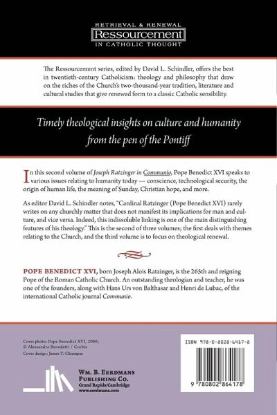 Timely theological insights on culture and humanity from the pen of the Pontiff In this second volume of Joseph Ratzinger in Communio, Pope Benedict XVI speaks to various issues relating to humanity today -- conscience, technological security, the origin of human life, the meaning of Sunday, Christian hope, and more. As editor David L. Schindler notes, "Cardinal Ratzinger (Pope Benedict XVI) rarely writes on any churchly matter that does not manifest its implications for man and culture, and vice versa. Indeed, this indissoluble linking is one of the main distinguishing features of his theology." This is the second of three volumes; the first deals with themes relating to the Church, and the third volume is to focus on theological renewal.