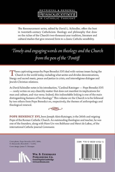 These captivating essays by Pope Benedict XVI deal with various issues facing the Church in the world today, including what unites and divides denominations, liturgy and sacred music, peace and justice in crisis, and interreligious dialogue and Jewish-Christian relations. As David Schindler notes in his introduction, "Cardinal Ratzinger -- Pope Benedict XVI -- rarely writes on any churchly matter that does not manifest its implications for man and culture, and vice versa. Indeed, this indissoluble linking is one of the main distinguishing features of his theology." This volume on the Church is to be followed by two others from Pope Benedict on, respectively, the themes of anthropology and theological renewal.