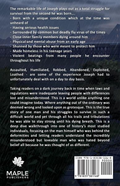 Assaulted, Humiliated, Robbed, Abandoned, Exploited, Loathed - are some of the experience Joseph had to unfortunately deal with on a day to day basis. Taking readers on a dark journey back in time when laws and regulations were inadequate leaving people with differences lost and misunderstood. This is a world unlike anything one could imagine today. Where anything out of the ordinary was deemed wrong and looked upon as grotesque. This is the true story of one man and his struggles to survive in such a difficult world and yet through all his trails and tribulations he was able to stay strong until his dying breathe. This is a deep dive walkthrough into one of history's most studied individuals, focusing on the man himself who was behind the deformities and letting readers understand the incredibly misunderstood but loveable man who was hated beyond belief all because he was thought of as different.