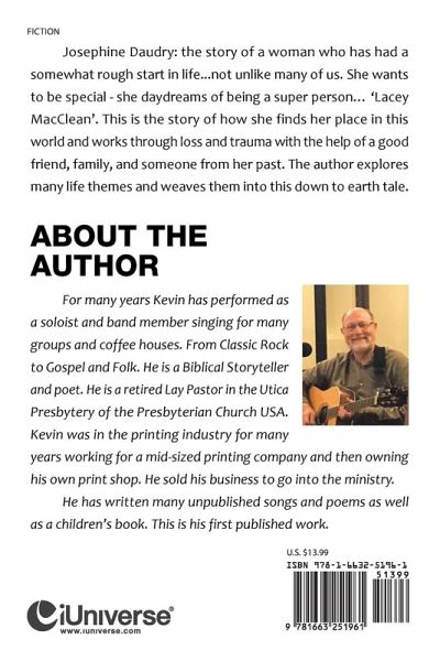 Josephine Daudry: the story of a woman who has had a somewhat rough start in life...not unlike many of us. She wants to be special - she daydreams of being a super person... 'Lacey MacClean'. This is the story of how she finds her place in this world and works through loss and trauma with the help of a good friend, family, and someone from her past. The author explores many life themes and weaves them into this down to earth tale.