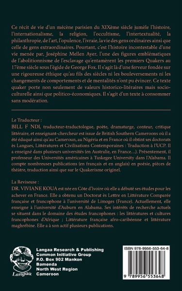 Ce récit de vie d'un mécène parisien du XIXème siècle jumèle l'histoire, l'internationalisme, la religion, l'occultisme, l'intertextualité, la philanthropie, de l'art, l'opulence, l'ivraie, la vie des gens ordinaires ainsi que celle de gens extraordinaires. Pourtant, c'est l'histoire incontestable d'une vie menée par, Joséphine Mellen Ayer, l'une des figures emblématiques de l'abolitionnisme de l'esclavage qu'entamèrent les premiers Quakers au 17ème siècle sous l'égide de George Fox. Il s'agit là d'une ferveur fondée sur une rigoureuse éthique qu'au fils des siècles ni les bouleversements ni les changements de comportements et de mentalités n'ont pu évincer. Ce texte quaker porte non seulement de valeurs historico-litéraires mais socio-culturelle ainsi que politico-économiques. Il s'agit d'un texte à consommer sans modération. Bill F Ndi, traducteur-traductologue, poète, dramaturge, conteur, critique littéraire, et enseignant-chercheur est issue de British Southern Cameroons où il a été éduqué ainsi qu'au Cameroun, au Nigéria et en France où il obtint ses doctorats ès Langues, Littératures et Civilisations Contemporaines: Traduction à l'UCP. Il a enseigné dans plusieurs universités. Présentement, il professeur des Universités américaines à Tuskegee University dans l'Alabama.