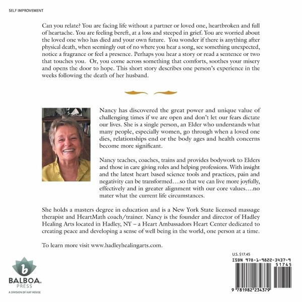 Can you relate? You are facing life without a partner or loved one, heartbroken and full of heartache. You are feeling bereft, at a loss and steeped in grief. You are worried about your loved one who has died. You wonder if there is anything after physical death, when seemingly out of no where you hear a song, see something unexpected, smell a fragrance, feel a presence, hear a story or read a sentence or two that touches you. You come across something that comforts, soothes your misery and opens the door to hope. This short story describes one person's experience in the weeks following the death of her husband.