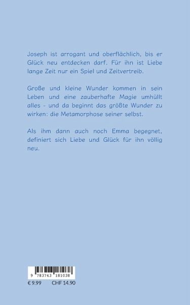 Joseph ist arrogant und oberflächlich, bis er Glück neu entdecken darf. Für ihn ist Liebe lange Zeit nur ein Spiel und Zeitvertreib.Große und kleine Wunder kommen in sein Leben und eine zauberhafte Magie umhüllt alles - und da beginnt das größte Wunder zu wirken: die Metamorphose seiner selbst.Als ihm dann auch noch Emma begegnet, definiert sich Liebe und Glück für ihn völlig neu.
