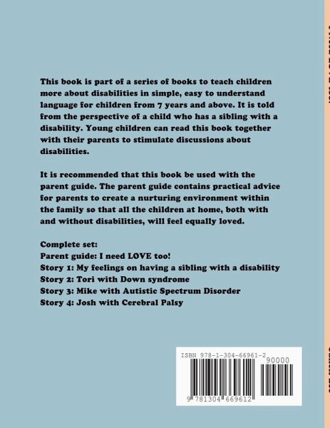This illustrated book is part of a series of books to teach children more about disabilities in simple, easy to understand language for children from 7 years and above. It is told from the perspective of a child who has a sibling with Cerebral Palsy. Young children can read this book together with their parents to stimulate discussions about Cerebral Palsy. It is recommended that this book be used with the parent guide. The parent guide contains practical advice for parents to create a nurturing environment within the family so that all the children at home, both with and without disabilities, will feel equally loved. Complete set: Parent guide: I need LOVE too! Story 1: My feelings on having a sibling with a disability Story 2: Tori with Down Syndrome Story 3: Mike with Autistic Spectrum Disorder Story 4: Josh with Cerebral Palsy