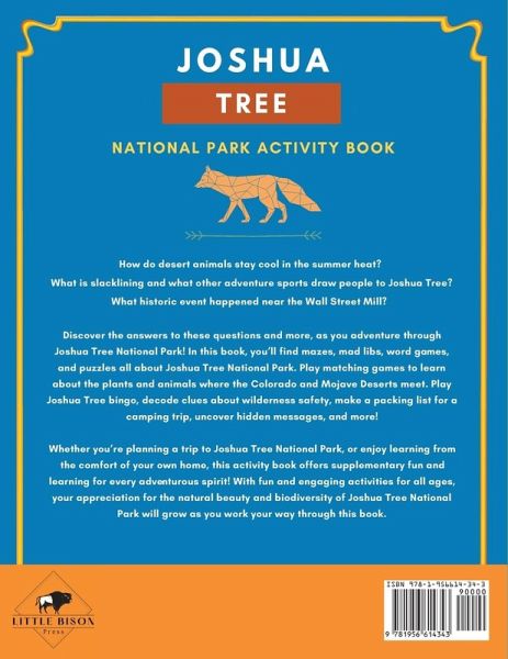 Learn about Joshua Tree National Park and have fun at the same time! Activity book for kids ages 8 to 11. Encourage young nature lovers to learn about Joshua Tree National Park. This book is filled with fun and educational activities like mazes, mad libs, word games, and puzzles. Play matching games about the plants and animals that live in the park. Learn about Leave No Trace principles and consider your impact on the land. Test your knowledge of outdoor ethics, decode clues about other national parks, make a packing list for a camping trip, and color some amphibians. Kids will also learn about conservation while using their imaginations to pretend they are a park ranger. This standout activity book includes: ¿ 45 pages of independent activities¿Create a PSA to protect endangered species, decode clues using the American Manual Alphabet (ASL), practice sound observation, design a souvenir water bottle, and more! ¿ Range of adaptable activities for anywhere¿The activity pages offer complementary learning with or without a visit to Joshua Tree National Park. Activities are appropriate and adaptable so all kids can start learning, no matter where they are. ¿ Important skill-building¿By stopping to notice and record what's going on around them, kids will practice important skills like creative thinking, observation, writing, drawing, wilderness safety, and more. This book is great for long car rides, screen-free time, vacation, camping trips, or a trip to Joshua Tree National Park.