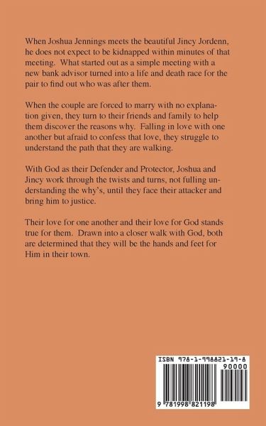 When Joshua Jennings meets the beautiful Jincy Jordenn, he does not expect to be kidnapped within minutes of that meeting. What started out as a simple meeting with a new bank advisor turned into a life and death race for the pair to find out who was after them. When the couple are forced to marry with no explanation given, they turn to their friends and family to help them discover the reasons why. Falling in love with one another but afraid to confess that love, they struggle to understand the path that they are walking. With God as their Defender and Protector, Joshua and Jincy work through the twists and turns, not fulling understanding the why's, until they face their attacker and bring him to justice. Their love for one another and their love for God stands true for them. Drawn into a closer walk with God, both are determined that they will be the hands and feet for Him in their town.