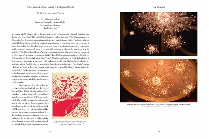 Josiah McElheny ( 1966 in Boston) verbindet das traditionelle Handwerk der Glasbläserkunst mit dem futuristischen Design der Moderne und reflektiert in spiegelnden Objekten grundsätzliche Fragen, etwa zur visuellen Wahrnehmung, zu den thematischen Diskursen der Moderne und dem Ursprung des Universums. Seit 2007 entwickelt der Künstler eine serielle Arbeit aus Skulpturen und Film, zu der ihn Paul Scheebarts Novelle Der Lichtclub von Batavia aus dem Jahr 1912 inspiriert hat. Anhand der Geschichte eines gläsernen Lichtbades zeigt McElheny, wie Glas als Medium für utopische Ideen in der modernen Architektur eingesetzt werden kann. Die Publikation stellt seine Werke zu diesem Projekt aus unterschiedlichen Blickwinkeln vor: Neben dem Kurator Bill Horrigan, dem Filmwissenschaftler Thomas Gunning, dem Historiker Richard Fletcher und der Verfasserin des Scripts zu McElhenys Film Rachel Zolf kommt auch der Künstler selbst sowie der ein oder andere Künstlerkollege zu Wort.