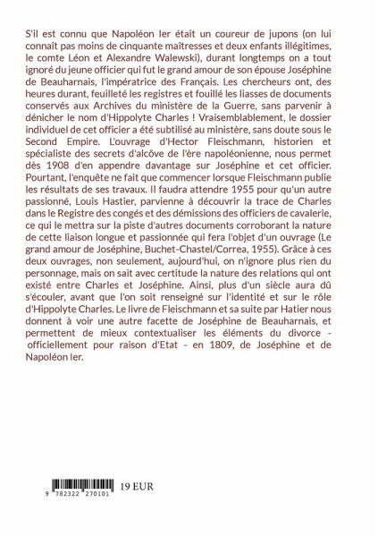 S'il est connu que Napoléon Ier était un coureur de jupons (on lui connaît pas moins de cinquante maîtresses et deux enfants illégitimes, le comte Léon et Alexandre Walewski), durant longtemps on a tout ignoré du jeune officier qui fut le grand amour de son épouse Joséphine de Beauharnais, l'impératrice des Français. Les chercheurs ont, des heures durant, feuilleté les registres et fouillé les liasses de documents conservés aux Archives du ministère de la Guerre, sans parvenir à dénicher le nom d'Hippolyte Charles ! Vraisemblablement, le dossier individuel de cet officier a été subtilisé au ministère, sans doute sous le Second Empire. L'ouvrage d'Hector Fleischmann, historien et spécialiste des secrets d'alcôve de l'ère napoléonienne, nous permet dès 1908 d'en appendre davantage sur Joséphine et cet officier. Pourtant, l'enquête ne fait que commencer lorsque Fleischmann publie les résultats de ses travaux. Il faudra attendre 1955 pour qu'un autre passionné, Louis Hastier, parvienne à découvrir la trace de Charles dans le Registre des congés et des démissions des officiers de cavalerie, ce qui le mettra sur la piste d'autres documents corroborant la nature de cette liaison longue et passionnée qui fera l'objet d'un ouvrage (Le grand amour de Joséphine, Buchet-Chastel/Correa, 1955). Grâce à ces deux ouvrages, non seulement, aujourd'hui, on n'ignore plus rien du personnage, mais on sait avec certitude la nature des relations qui ont existé entre Charles et Joséphine. Ainsi, plus d'un siècle aura dû s'écouler, avant que l'on soit renseigné sur l'identité et sur le rôle d'Hippolyte Charles. Le livre de Fleischmann et sa suite par Hatier nous donnent à voir une autre facette de Joséphine de Beauharnais, et permettent de mieux contextualiser les éléments du divorce - officiellement pour raison d'Etat - en 1809, de Joséphine et de Napoléon Ier.