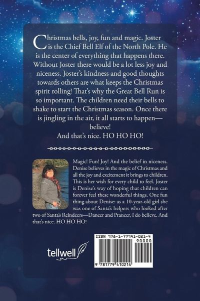 Christmas bells, joy, fun and magic. Joster is the Chief Bell Elf of the North Pole. He is the center of everything that happens there. Without Joster there would be a lot less joy and niceness. Joster's kindness and good thoughts towards others are what keeps the Christmas spirit rolling! That's why the Great Bell Run is so important. The children need their bells to shake to start the Christmas season. Once there is jingling in the air, it all starts to happen-believe!And that's nice. HO HO HO!