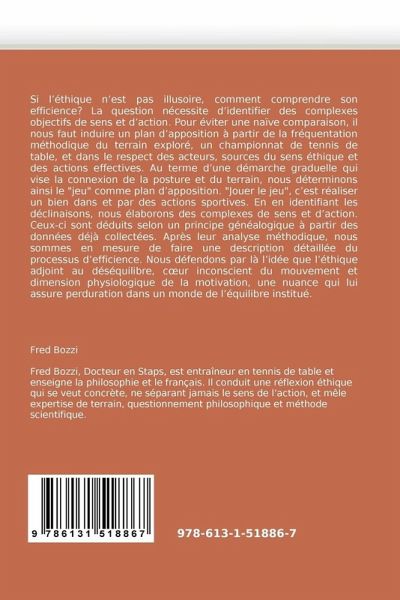Si l''éthique n''est pas illusoire, comment comprendre son efficience? La question nécessite d''identifier des complexes objectifs de sens et d''action. Pour éviter une naïve comparaison, il nous faut induire un plan d''apposition à partir de la fréquentation méthodique du terrain exploré, un championnat de tennis de table, et dans le respect des acteurs, sources du sens éthique et des actions effectives. Au terme d''une démarche graduelle qui vise la connexion de la posture et du terrain, nous déterminons ainsi le "jeu" comme plan d''apposition. "Jouer le jeu", c''est réaliser un bien dans et par des actions sportives. En en identifiant les déclinaisons, nous élaborons des complexes de sens et d''action. Ceux-ci sont déduits selon un principe généalogique à partir des données déjà collectées. Après leur analyse méthodique, nous sommes en mesure de faire une description détaillée du processus d''efficience. Nous défendons par là l''idée que l''éthique adjoint au déséquilibre, c ur inconscient du mouvement et dimension physiologique de la motivation, une nuance qui lui assure perduration dans un monde de l''équilibre institué.