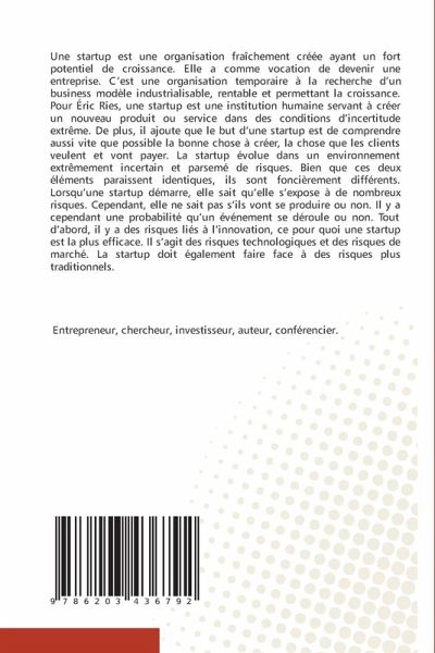 Une startup est une organisation fraîchement créée ayant un fort potentiel de croissance. Elle a comme vocation de devenir une entreprise. C'est une organisation temporaire à la recherche d'un business modèle industrialisable, rentable et permettant la croissance. Pour Éric Ries, une startup est une institution humaine servant à créer un nouveau produit ou service dans des conditions d'incertitude extrême. De plus, il ajoute que le but d'une startup est de comprendre aussi vite que possible la bonne chose à créer, la chose que les clients veulent et vont payer. La startup évolue dans un environnement extrêmement incertain et parsemé de risques. Bien que ces deux éléments paraissent identiques, ils sont foncièrement différents. Lorsqu'une startup démarre, elle sait qu'elle s'expose à de nombreux risques. Cependant, elle ne sait pas s'ils vont se produire ou non. Il y a cependant une probabilité qu'un événement se déroule ou non. Tout d'abord, il y a des risques liés à l'innovation, ce pour quoi une startup est la plus efficace. Il s'agit des risques technologiques et des risques de marché. La startup doit également faire face à des risques plus traditionnels.