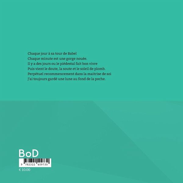 Chaque jour a sa tour de BabelChaque minute est une gorge nouéeIl y a des jours ou le piédestal fait bon vivre Puis vient le doute, la soute et le soleil de plombPerpétuel recommencement dans la maitrise de soi J'ai toujours gardé une lune au fond de la poche