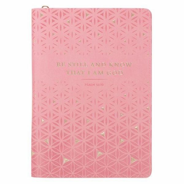 The Be Still and Know Geometric Pink Faux Leather Journal with Zipper Closure offers a calm, feminine place to pause and reflect. The women's journal has a quiet, geometric design that complements the stillness and peace promised in Scripture.