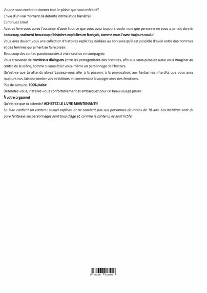 Voulez-vous exciter et donner tout le plaisir que vous méritez?Envie d'un vrai moment de détente intime et de bienêtre?Continuez à lire!Avec ce livre vous aurez l'occasion d'avoir tout ce que vous avez toujours voulu mais que personne ne vous a jamais donné: beaucoup, vraiment beaucoup d'histoires explicites en français, comme vous l'avez toujours voulu!Vous avez devant vous une collection d'histoires explicites dédiées au bon sexe qu'il est possible d'avoir entre des hommes et des femmes qui aiment se faire plaisir. Beaucoup des contes passionnantes à vivre seul ou en compagnie.Vous trouverez de nombreux dialogues entre les protagonistes des histoires, afin que vous puissiez aussi vous imaginer au centre de la scène, comme si vous étiez vous-même un personnage de l'histoire.Qu'est-ce que tu attends alors? Laissez-vous aller à la passion, à la provocation, aux fantasmes interdits que vous avez toujours eus, laissez tomber vos inhibitions et commencez à voyager avec des émotions.Pas de censure, 100 pour 100 de plaisir.Détendez-vous, installez-vous confortablement et embarquez pour un beau voyage plaisir.À votre orgasme!