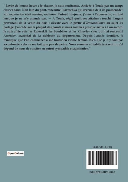 " Levée de bonne heure ; le rhume, je suis souffrante. Arrivée à Toula par un temps clair et doux. Non loin du pont, rencontré Liovotchka qui revenait déjà de promenade ; son expression était sereine, radieuse. Partout, toujours, j¿aime à l¿apercevoir, surtout lorsque je ne m¿y attends pas. ¿ A Toula, réglé quelques affaires : touché l¿argent provenant de la vente du bois ; discuté avec le prêtre d¿Ovsiannikovo au sujet du partage. J¿ai cédé sur la plupart des points et nous sommes presque arrivés à un accord. Je suis allée voir les Raievskii, les Sverbéiev et les Zinoviev chez qui j¿ai rencontré Arséniev, maréchal de la noblesse du département. Depuis l¿année dernière, je remarque que l¿on commence à me traiter en vieille femme. Bien que je n¿y sois pas accoutumée, cela ne me fait que peu de peine. Nous sommes si habitués à sentir qüil dépend de nous de susciter en autrui sympathie et admiration."