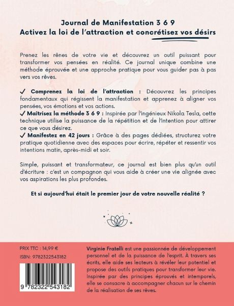 Journal de Manifestation 3-6-9 Activez la Loi de l'Attraction et Concrétisez Vos Désirs avec la Méthode 369 Et si vous déteniez le secret pour transformer vos rêves en réalité ? Le Journal de Manifestation 3-6-9 est bien plus qu'un simple carnet : c'est un outil puissant, une méthode éprouvée et un guide structuré pour activer la Loi de l'Attraction. Grâce à lui, vous apprendrez à aligner vos pensées, vos émotions et vos actions avec vos aspirations les plus profondes. Pourquoi ce journal est-il unique ? - Une méthode universelle et puissante : Inspirée des travaux visionnaires de Nikola Tesla, la méthode 3-6-9 repose sur la répétition ciblée et intentionnelle. Cette technique amplifie votre énergie et crée une dynamique extraordinaire pour attirer vos désirs. - Un guide accessible et complet : Découvrez des explications claires sur la Loi de l'Attraction et des instructions détaillées pour maîtriser la méthode 3-6-9. Apprenez à clarifier vos pensées, formuler des intentions précises et cultiver des émotions positives pour transformer vos rêves en réalité. - 42 jours de pratique guidée : Avec un espace dédié à 42 jours de manifestations, ce journal vous offre une structure quotidienne simple mais puissante pour ancrer vos intentions. Chaque jour, suivez un processus clair pour observer la progression de vos désirs et amorcer une transformation durable dans votre vie. Pour qui ce journal est-il fait ? Que vous soyez novice ou déjà initié(e), le Journal de Manifestation 3-6-9 s'adresse à toutes celles et ceux qui souhaitent : - Prendre le contrôle de leur vie et manifester leurs désirs avec clarté et intention. - Explorer une méthode pratique et accessible pour révéler leur potentiel. - Offrir un cadeau significatif, inspirant et porteur de sens à un proche. Ce qui rend ce journal exceptionnel : Le Journal de Manifestation 3-6-9 se distingue par l'équilibre unique entre théorie et pratique. Alliant principes éprouvés, explications simples et une méthode concrète, il inspire confiance et motivation tout en vous donnant les outils nécessaires pour créer la vie que vous méritez. Transformez votre vie dès aujourd'hui. Commencez dès maintenant à manifester vos désirs et à créer la réalité dont vous rêvez. Ajoutez-le au panier et passez à l'action dès aujourd'hui !