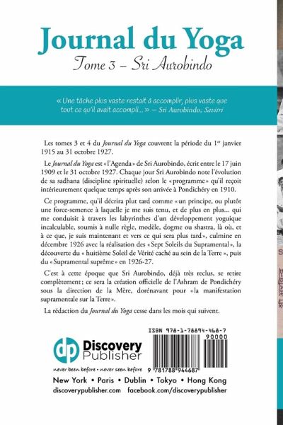 Les tomes 3 et 4 du Journal du Yoga couvrent la période du 1er janvier 1915 au 31 octobre 1927. Le Journal du Yoga est « l'Agenda » de Sri Aurobindo, écrit entre le 17 juin 1909 et le 31 octobre 1927. Chaque jour Sri Aurobindo note l'évolution de sa sadhana (discipline spirituelle) selon le « programme » qu'il reçoit intérieurement quelque temps après son arrivée à Pondichéry en 1910. Ce programme, qu'il décrira plut tard comme « un principe, ou plutôt une force-semence à laquelle je me suis tenu, et de plus en plus... qui me conduisit à travers les labyrinthes d'un développement yoguique incalculable, soumis à nulle règle, modèle, dogme ou shastra, là où, et à ce que, je suis maintenant et vers ce qui sera plus tard », culmine en décembre 1926 avec la réalisation des « Sept Soleils du Supramental », la découverte du « huitième Soleil de Vérité caché au sein de la Terre », puis du « Supramental suprême » en 1926-27. C'est à cette époque que Sri Aurobindo, déjà très reclus, se retire complètement ; ce sera la création officielle de l'Ashram de Pondichéry sous la direction de la Mère, dorénavant pour « la manifestation supramentale sur la Terre ». La rédaction du Journal du Yoga cesse dans les mois qui suivent. Note de l'éditeur : Afin d'être plus agréable lors de la lecture, cet ouvrage est au format Beau Livre, 6"x9", 15x23cm. Dans la même optique, le papier est de couleur crème, ce qui fatigue moins les yeux que le papier blanc. Toutes nos publications font l'objet d'un travail soigné tant au niveau typographique qu'au niveau du design. 524 pages.